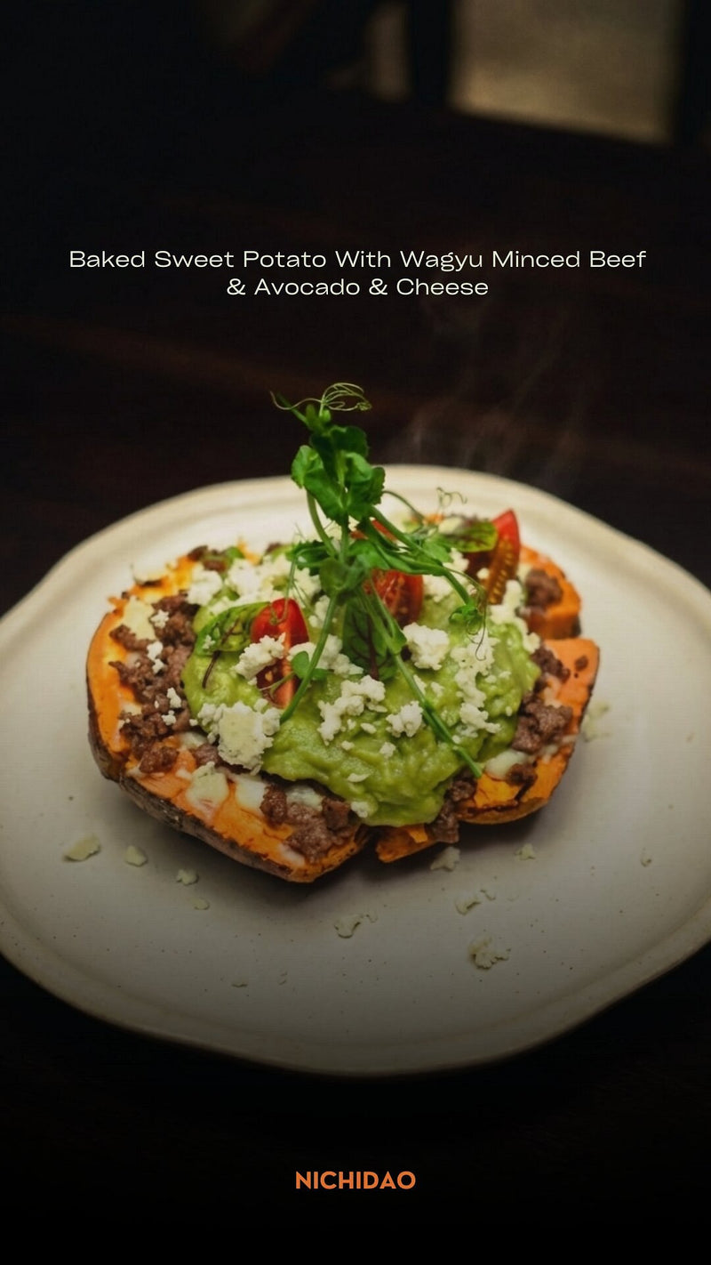 Baked Sweet Potato with Wagyu Minched Beef & Avocado & Cheese